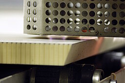 Um den dekorativen Anforderungen an die Möbelteile gerecht zu werden, werden die Hartschaumelemente mit hochwertigen Möbelfolien kaschiert. Eine Openair-Plasma® Vorbehandlung ermöglicht die sichere und langzeitstabile Haftung ohne den Einsatz von Haftvermittlern (Primern). Die geschäumten PU-Teile sind nicht nur optisch sehr anspruchsvoll, sie übertreffen die Eigenschaften der Tropenhölzer in Leichtigkeit und Langlebigkeit zudem um ein Vielfaches.